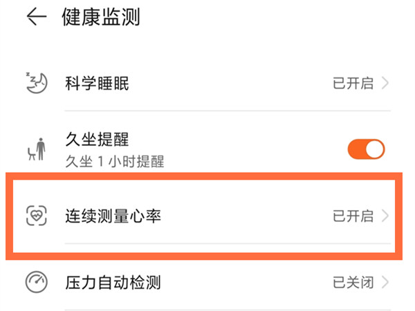 2、进入健康监测后,点击连续测量心率,将其开关开启即可。