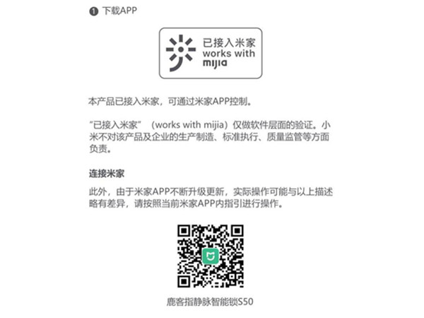 1) 请确保打开手机蓝牙和定位权限, 进入“米家”APP, 点击添加设备, 选择 “鹿客指静脉智能锁S50”;