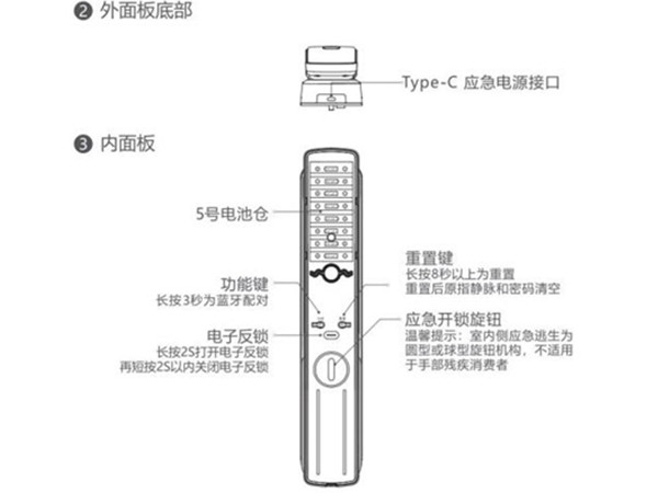 则室外只能通过管理员指纹/密码/NFC卡/手机 蓝牙/应急钥匙开门。 电子反锁可在门锁面板上长按2秒打开/关闭。
