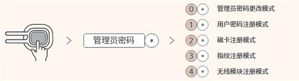 进入注册模式后,请根据语音提示,注册认证方式(密码、磁卡、指纹)。