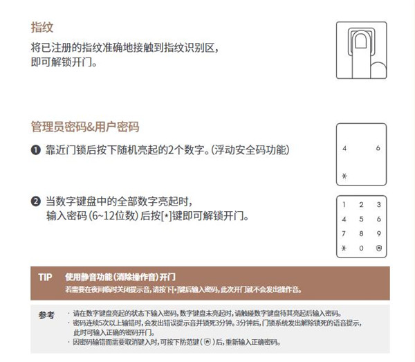 当用户接近门锁时,数字键盘自动亮起,磁卡以及指纹识别区同时进入等待认证 模式。开启迎宾及鸣笛提示功能后,若在门锁前停留超过1分钟时,门锁会发出