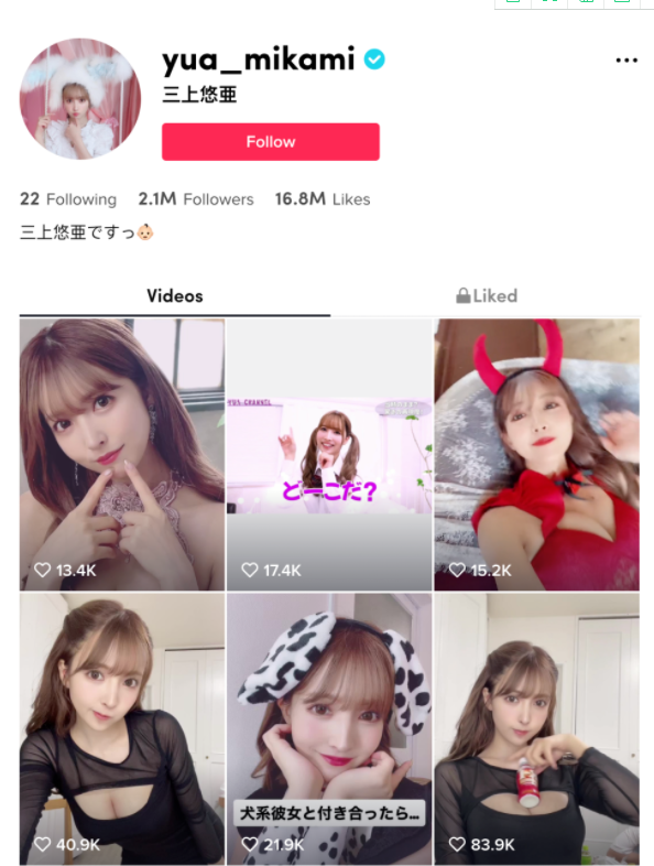 目前三上悠亚在tiktok上拥有210万粉丝,累计获赞已达1680万,更新也非常勤快,妥妥的业界短视频第一人