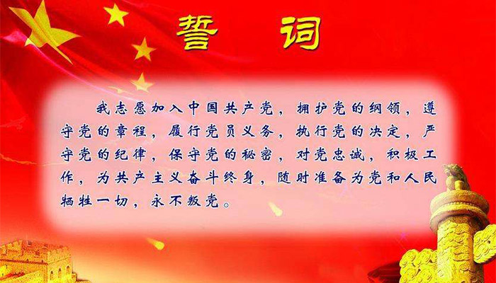 入党誓词的内容是“我志愿加入中国共产党,拥护党的纲领,遵守党的章程,履行党员义务,执行党的决定,严守党的纪律,保守党的秘密,对党忠诚,积极工作,为共产主义奋斗终身,随时准备为党和人民牺牲一切,永不叛党。”入党誓词在不同时期经过多次修改,在党的十二大上正式把入党誓词写入了党章。