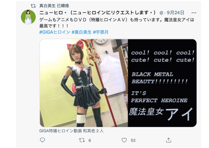 有在关注真白美生的朋友想必注意到了,这几天的twitter上她PO出了与监督“宇那月”合作的现场照片,演出的是特摄片商GIGA的作品,她变身为美少女战士—这也就是说在这个月的片子“ダメな仆を励ましてくれる勉强もヌキテクももんのすごい従妹と12発もヤリまくった夏” 后她就与SOD Star 分手了,而且以GIGA没有专属女艺人的状况来看,这位号称TOEIC分数超高英语一流的大学生就是要做企划女艺人去了…