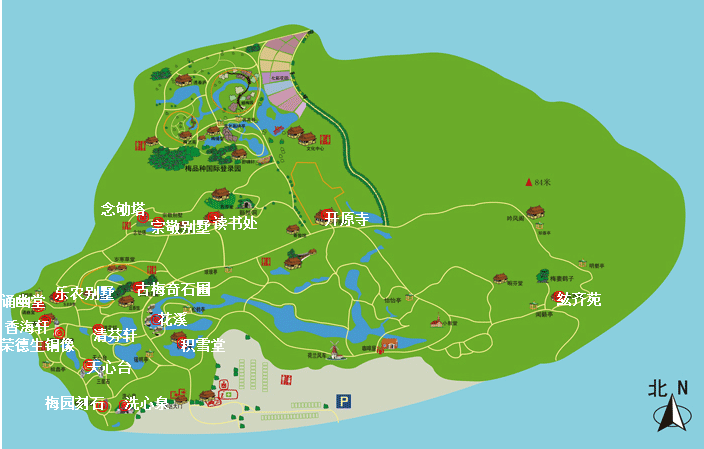 梅园梅花主要分布在荣氏梅园、古梅奇石圃、凝香道两侧、东横山及北园五个区域,除此之外,梅园中有积雪堂、洗心泉、紫藤刻石、天心台·三星石、香海·荣德生铜像、诵豳堂、乐农别墅、招鹤亭·小罗浮、念劬塔、宗敬别墅、读书处·豁然洞等多处景点,如果大家喜欢,可以按照景区的导览图,逐一参观。