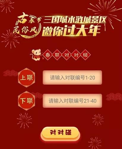火红灯笼高高挂,新春佳景这边独好,快来呀~在三国城香宁宫前布置灯笼景观,将春联以上下联分开的形式编号悬挂于灯笼之下,游人通过扫描灯笼下方飘带上的二维码进入程序对春联,成功匹配出春联即可参与抽奖,中奖的游客凭中奖信息即可前往三国城游客中心或水浒城导游服务处兑换饱含寓意的新春定制礼品。