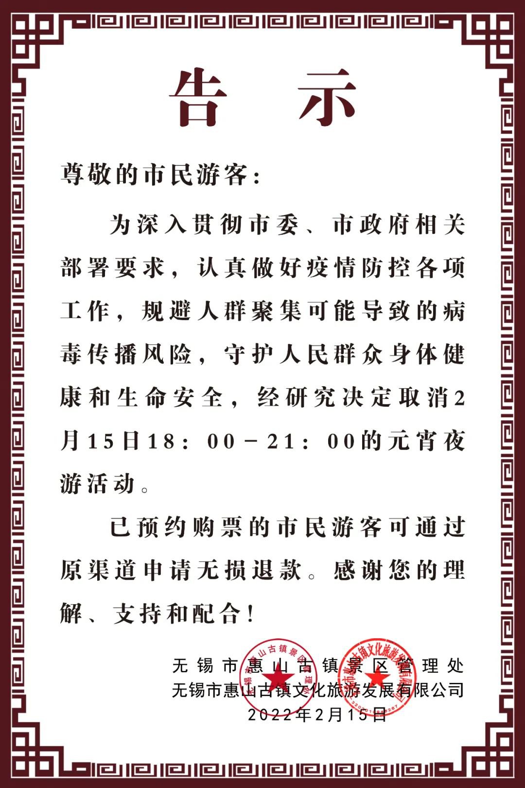 为深入贯彻市委、市政府相关部署要求,认真做好疫情防控各项工作,规避人群聚集可能导致的病毒传播风险,守护人民群众身体健康和生命安全,经研究决定取消2月15日18 : 00 – 21 : 00的元宵夜游活动。已预约购票的市民游客可通过原渠道申请无损退款。感谢您的理解、支持和配合!