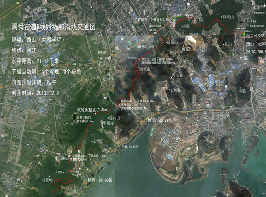 全线以宝界山林公园入口为起点,以9路公交车站台山军嶂村站为终点,全程共分为六段。第一段自宝界山林公园大门开始爬到大山头结束;第二段自大山头走山谷丛林迂回到大浮南村结束;第三段从大浮南村走至幸福水库;第四段从幸福水库开始绕行至橡胶二厂旧址,再翻山横切到盘龙路垭口。第五段从盘龙路垭口登上268米山军嶂山主峰,再下到龙寺后,穿越到龙寺生态园;第六段自生态园烧烤点上山,沿山脊向下穿越到山军嶂村结束。