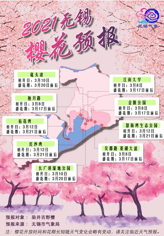 樱花盛开的适宜温度一般在20℃左右,一般鼋头渚樱花盛花期在3月下旬-4中上旬。