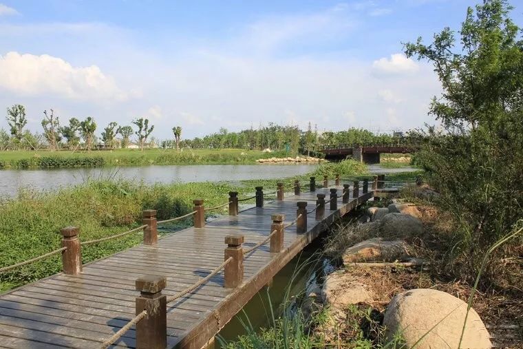 这条风光带上,有着沿水面设置的浪漫花坡,配合上碧波柳岸的江南美景,更显出江南水乡的柔美韵味。漫步在滨水木栈道上,整个生态公园的美景都能尽收眼底。