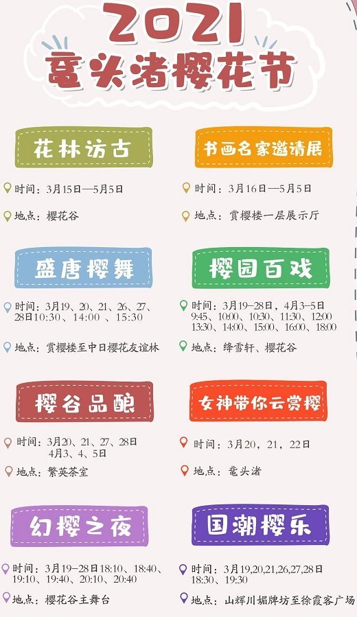 樱花节期间活动主要有:花林访古、书画名家邀请展、盛唐樱舞、樱园百戏、樱谷品酿、女神带你云赏樱、幻樱之夜、国潮樱乐
