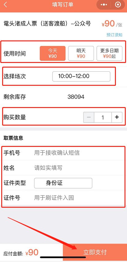 ③根据自己需求选择购票种类,之后进入票务信息填写及支付页面。选择游玩时间及时间段,填写个人信息,手机号勇于接收确认短信,身份证用于刷证件入园,填写之后支付即可。