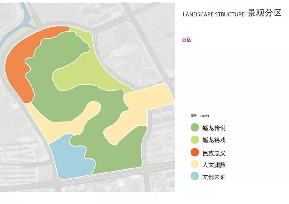 蟠龙山公园全园共分5个景观区,通过蟠龙传说、蟠龙锡戏、民族忠义、人文渊薮、文创未来这5篇章,打造江阴唐朝传说于一山,浪漫锡剧于一湖,民族精神于一园,高新风华于一轴,时代主题于一街。