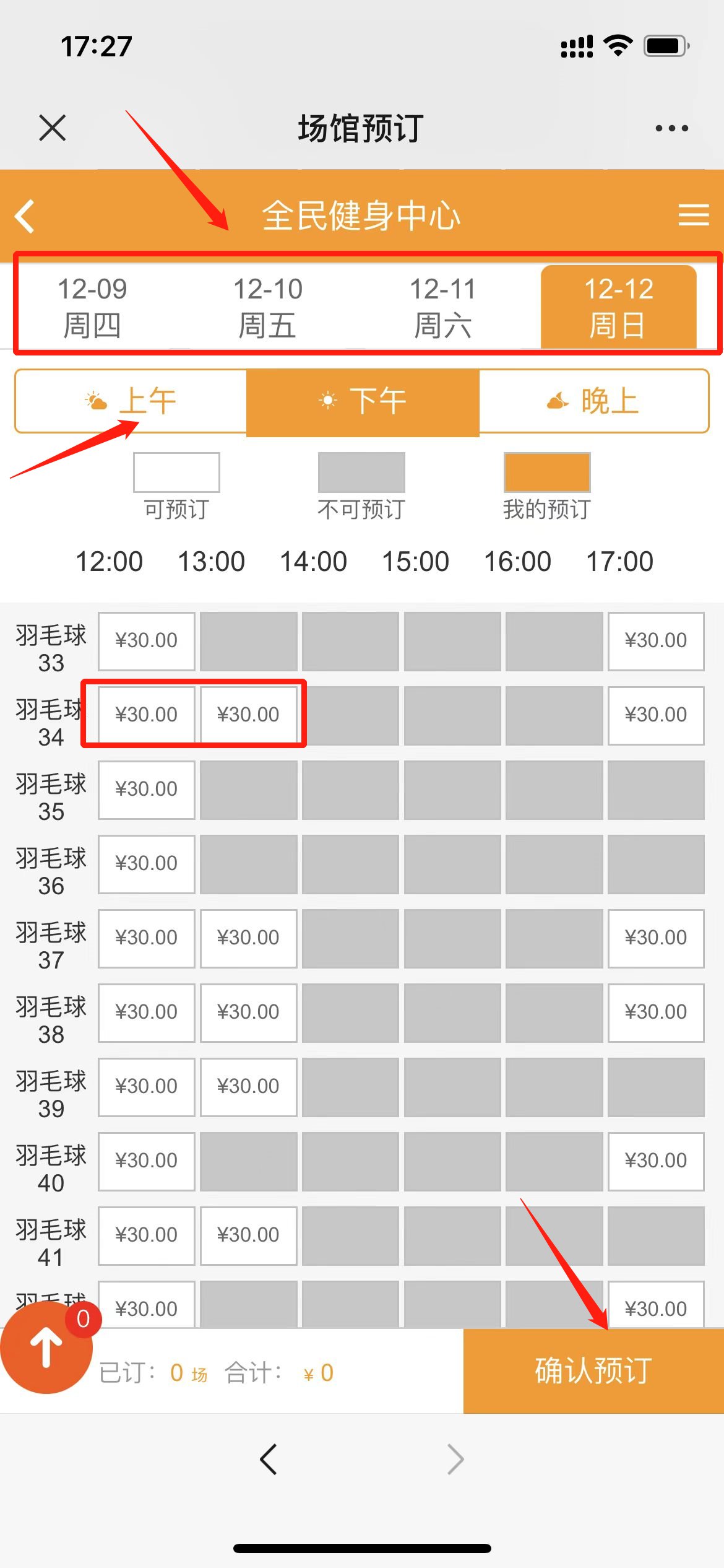 选择“日期”→“上午/下午/晚上”→“12:00,13:00…”→选择空白的场地,点击“立即预定”