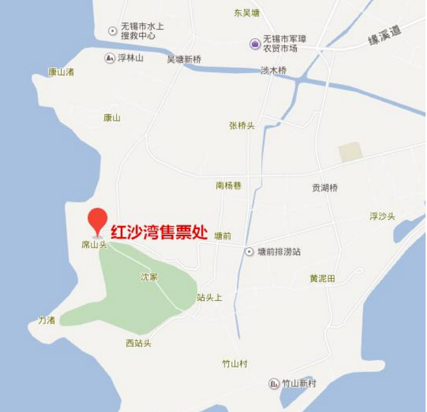蠡湖大桥直行蠡湖大道 — 右转高浪路 — 左转山水东路 — 右转山水西路 — 左转吴杨路直行一公里 — 靠右直行至红沙湾售票处