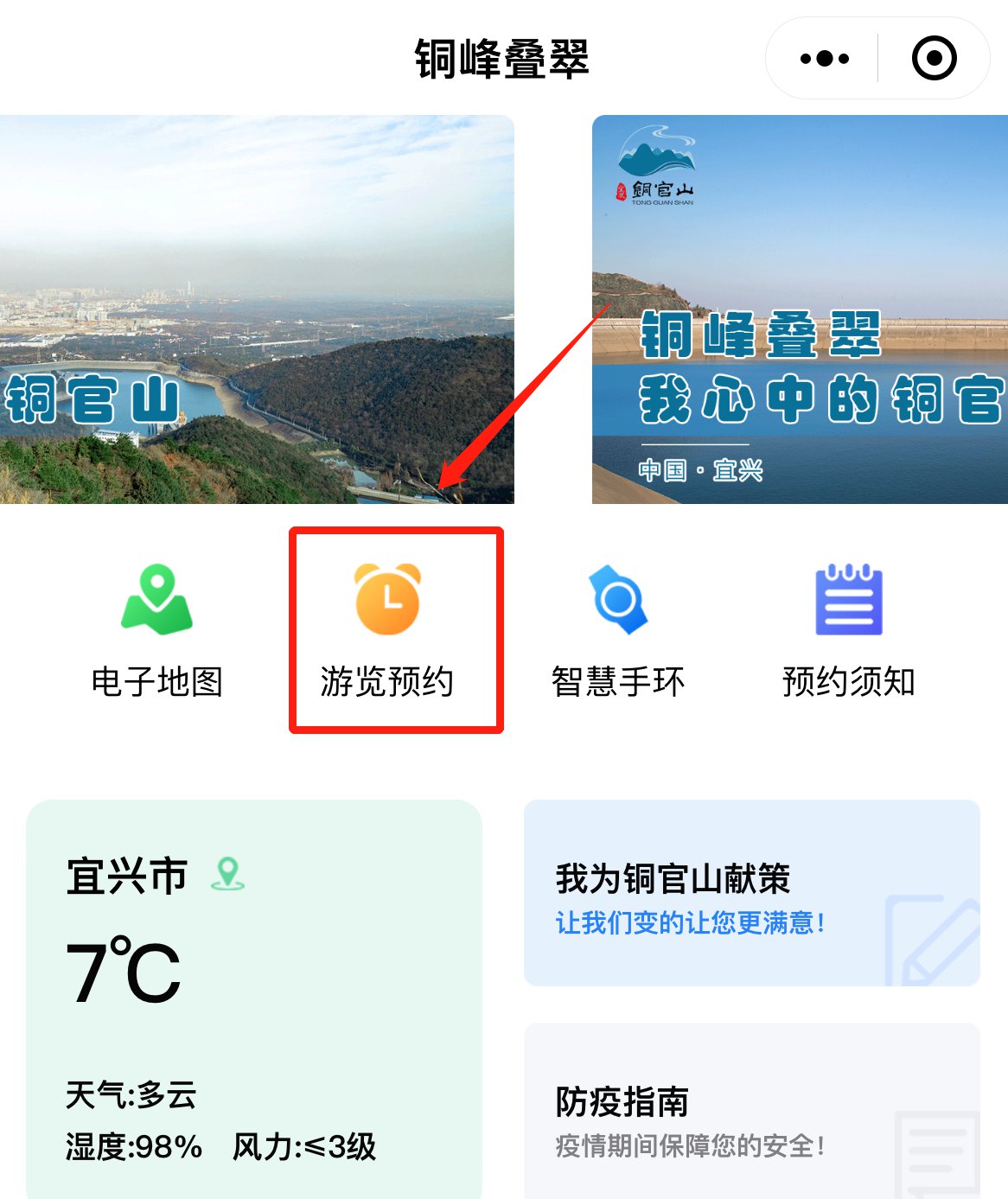 (1)铜官山官方微信公众号“铜峰叠翠”进行实名制预约,点击菜单栏“预约通道”-“游览预约”