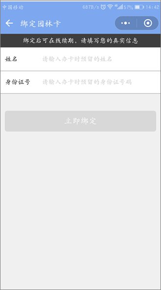 1、进入园林卡绑定页面,正确输入本人姓名、身份证号码,绑卡成功;