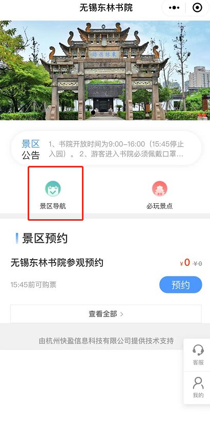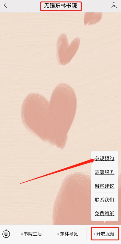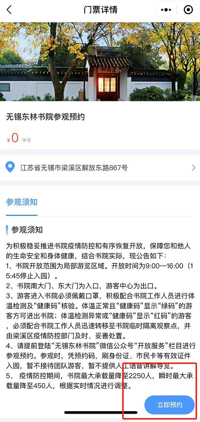 预约方式:关注“无锡东林书院”的官方微信公众号,在公众号的菜单栏点击“开放服务”然后选择“参观预约”即可进入预约界面,在预约界面填写入园日期、时间段、个人信息等,提交支付即可。