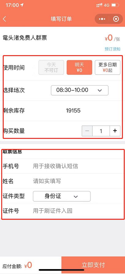 3.填写个人信息,选择预约场次等,支付“0”元即可。