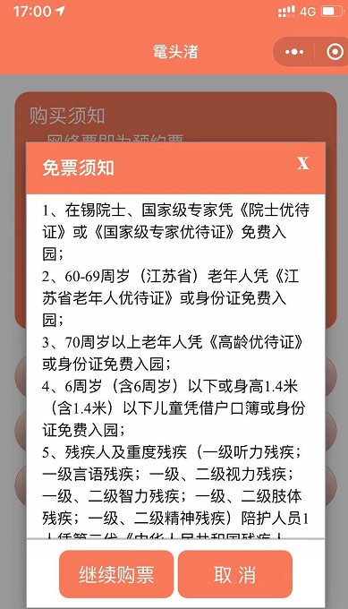 1.关注“无锡市太湖鼋头渚风景区”官方微信公众号,点击下方“预约购票”,扫描并识别弹出的二维码可进入购票入口页面或点此直接进入