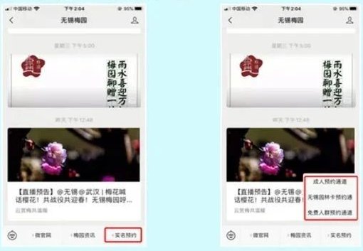3、无锡梅园微信公众号右下角实名预约,选择相应种类:成人票预约、免费人群预约、园林卡预约。