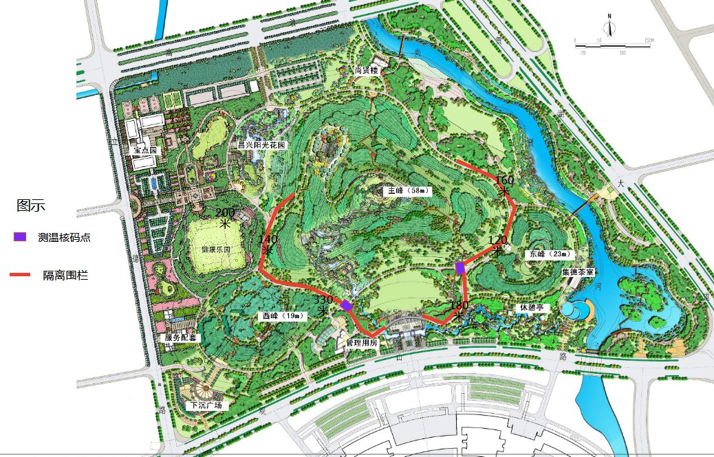 自2022年3月18日起,金匮公园樱花林实施限流,南广场、樱花林主峰设置警戒隔离围栏,入园赏樱人数达1000人后,将实施出多少进多少的措施,樱花大道东、西口为人员出入口,如下图所示: