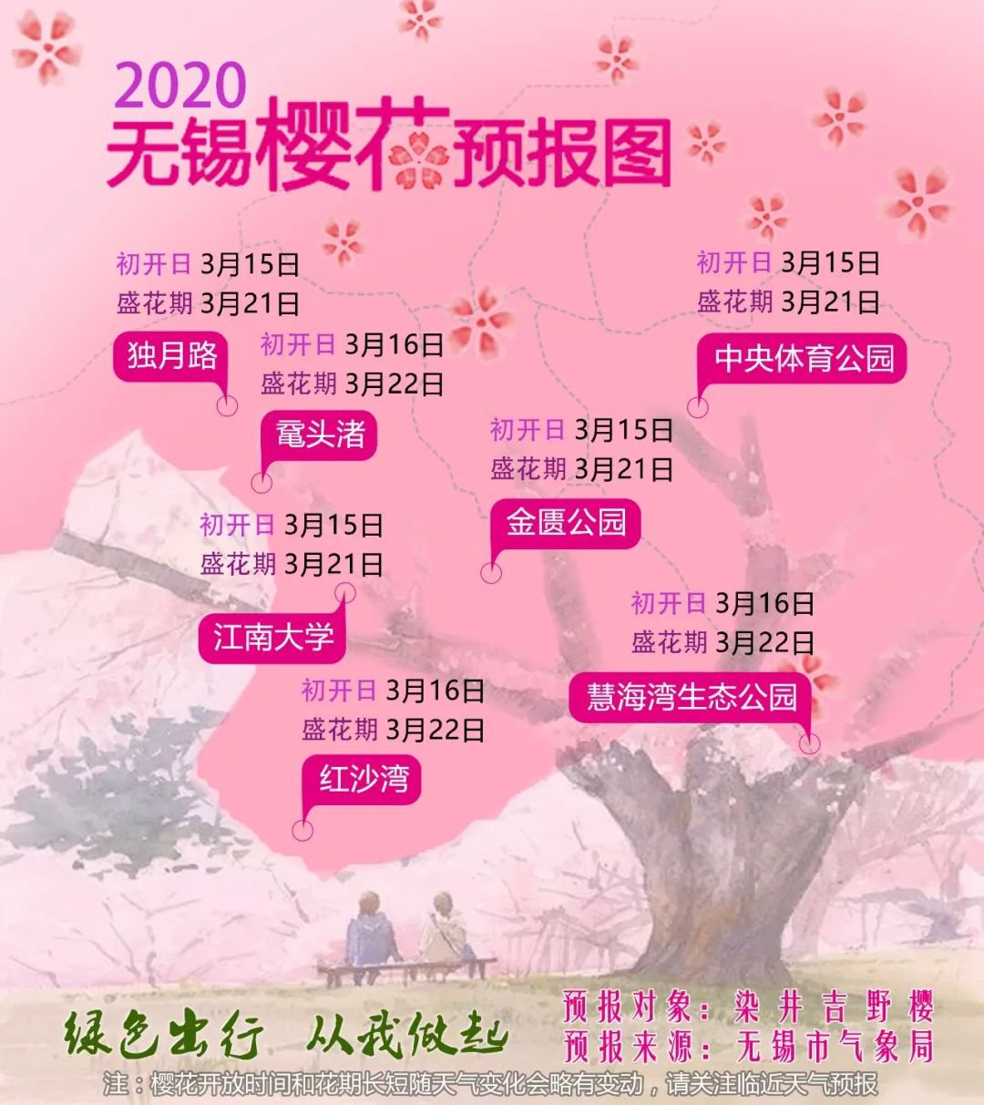 无锡市气象局发布2020年无锡樱花预报地图,预计今年染井吉野樱3月16日左右提前赴约。
