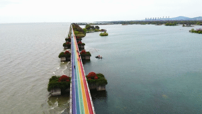 贡湖湾彩虹步道是2019年经开区重点规划建设的一条特色靓丽彩色带,蜿蜒3公里,五色线条绵延在粼粼的太湖波光中,静谧而温情。