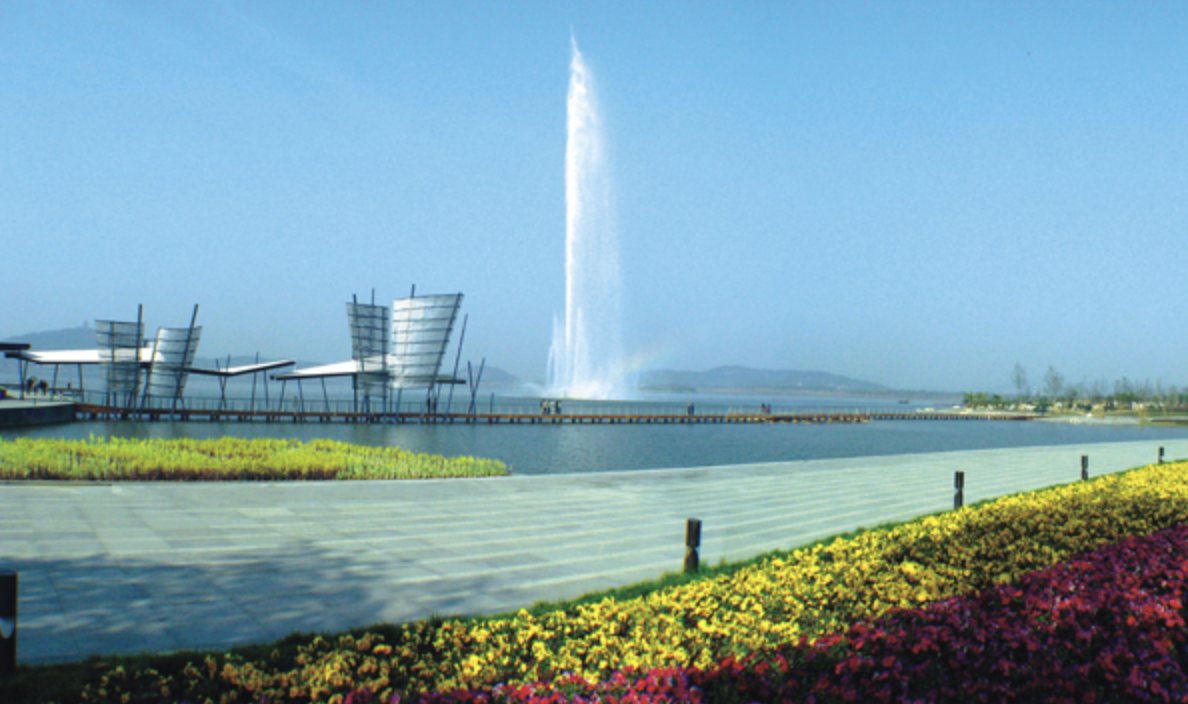 湖中百米喷泉位于城市之光节点外侧,距太湖大道终端延长线约400米。百米高喷是蠡湖标志性景观,它包括主喷与辅喷,主喷最大喷高120米,辅喷高40米,裙喷高30米,气势磅礴,高崇雄伟。主喷水柱如蛟龙出海,形成“一柱擎天”的湖中景观,辅喷环绕主喷,犹如一只硕大的水花篮,高低起伏,可有多种变幻,既能与主喷组合,也可单独运行,与湖岸栈桥、帆板式遮阳廊组合成壮观的飞泉帆影画面。