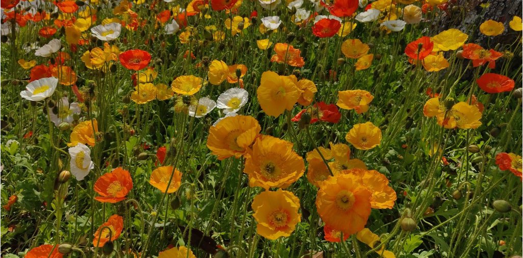 “虞美人”(又名:丽春花、赛牡丹、满园春、仙女蒿、虞美人草、舞草等)种植于七彩花田,其位于梅园梅品种登录园东北侧,总面积约1万平方米,每年的10月底播种,次年开花,花期为4月底到5月底。盛开时节,她们或红、或白、或黄、或粉地凑在一起,薄薄的花瓣娇嫩欲滴,随风起舞,华美异常。