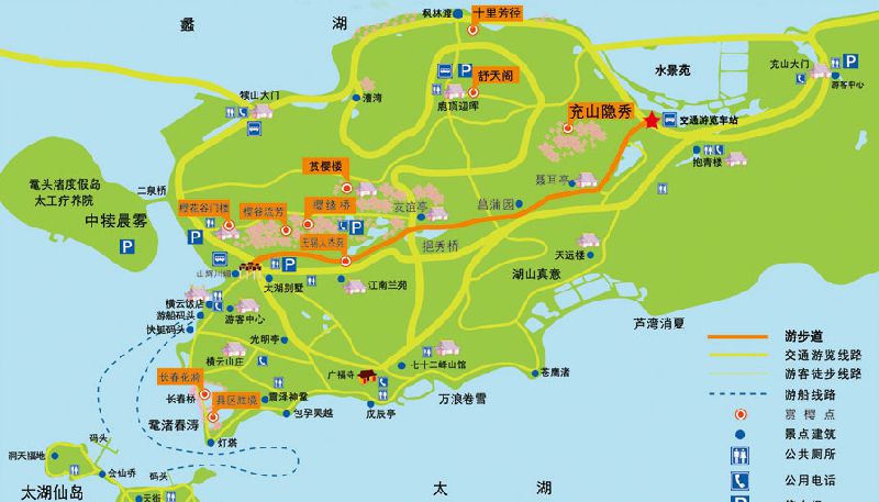 充山大门 → 充山隐秀 → 挹秀桥 → 樱花林 → 赏樱阁 → 人杰苑 → 樱花谷 → 樱缘桥 → 樱谷流芳 → 长春花漪 → 具境胜境 → 十里芳径
