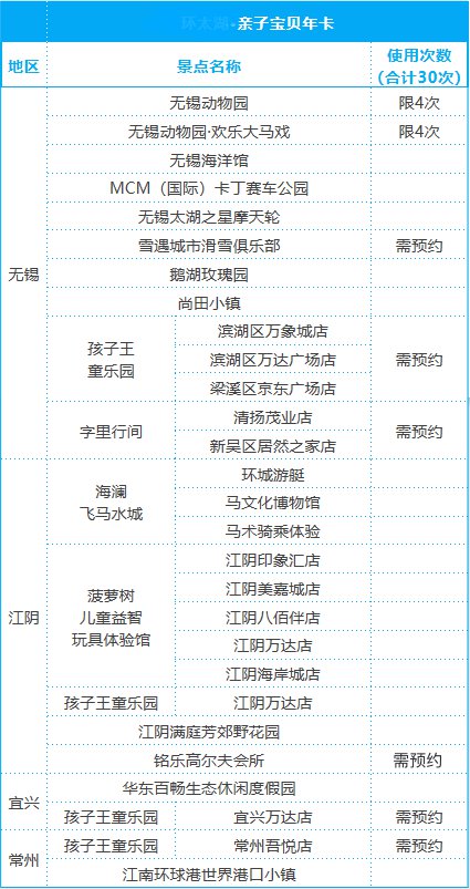 持该卡可在一年内(有效期至2021年12月31日)在无锡动物园、太湖之星摩天轮、江阴飞马水城、宜兴华东百畅生态休闲度假园等多个景点累计刷卡共30次,使亲子游乐更加实惠、便捷。