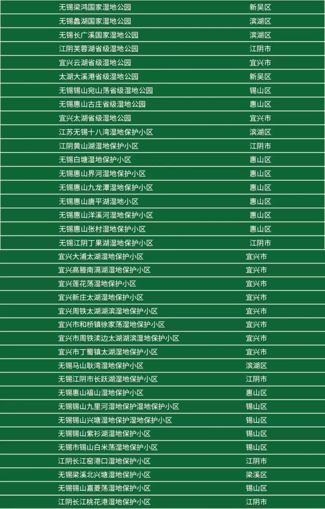 目前全市已建成蠡湖、长广溪、梁鸿3个国家湿地公园,6个省级湿地公园,28个湿地保护小区。具体如下: