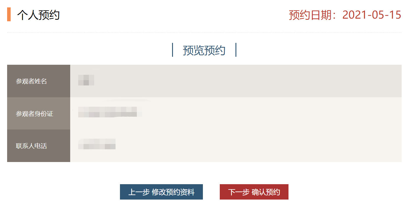 填写资料:姓名、身份证号码、联系电话、预约时间段