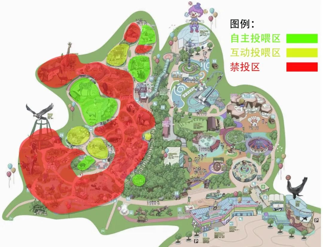 自主投喂区(游客可自带食物):食草动物区、欢乐草原、鹿苑、巨鸟园、嬉猴、崖熊山